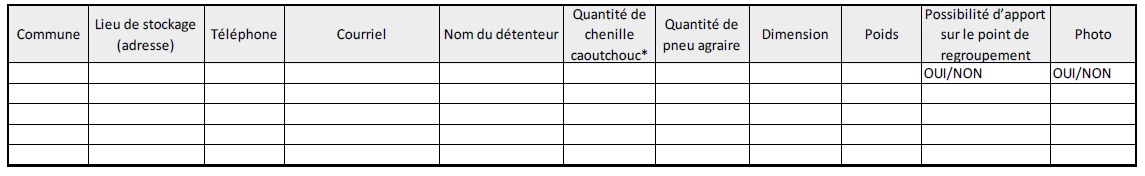 Il vous sera demandé de compléter le tableau ci-dessous et d’y joindre une photo des pneus agraires et / ou chenilles en caoutchouc usagés :