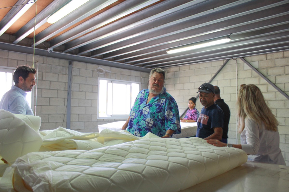 La délégation a débuté sa visite par Calmousse, une entreprise incontournable en Nouvelle-Calédonie sur le marché de la literie depuis 1995. Accueilli par le gérant M. Claude SIRET et de ses deux fils, le groupe a eu la chance de visiter les ateliers de confection et de rencontrer les salariés.