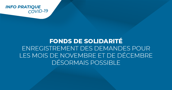 Il est désormais possible de faire votre demande d’aide relative au fonds de solidarité de l’Etat pour la période du 1er au 30 novembre 2021 et du 1er au 31 décembre 2021. Vous avez jusqu’au 31 mars 2022 pour faire votre demande.